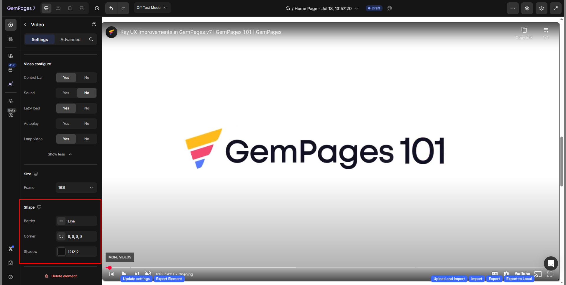 When you click on the Video element, its configuration options will appear on the left sidebar. These options will be explained in the upcoming sections.