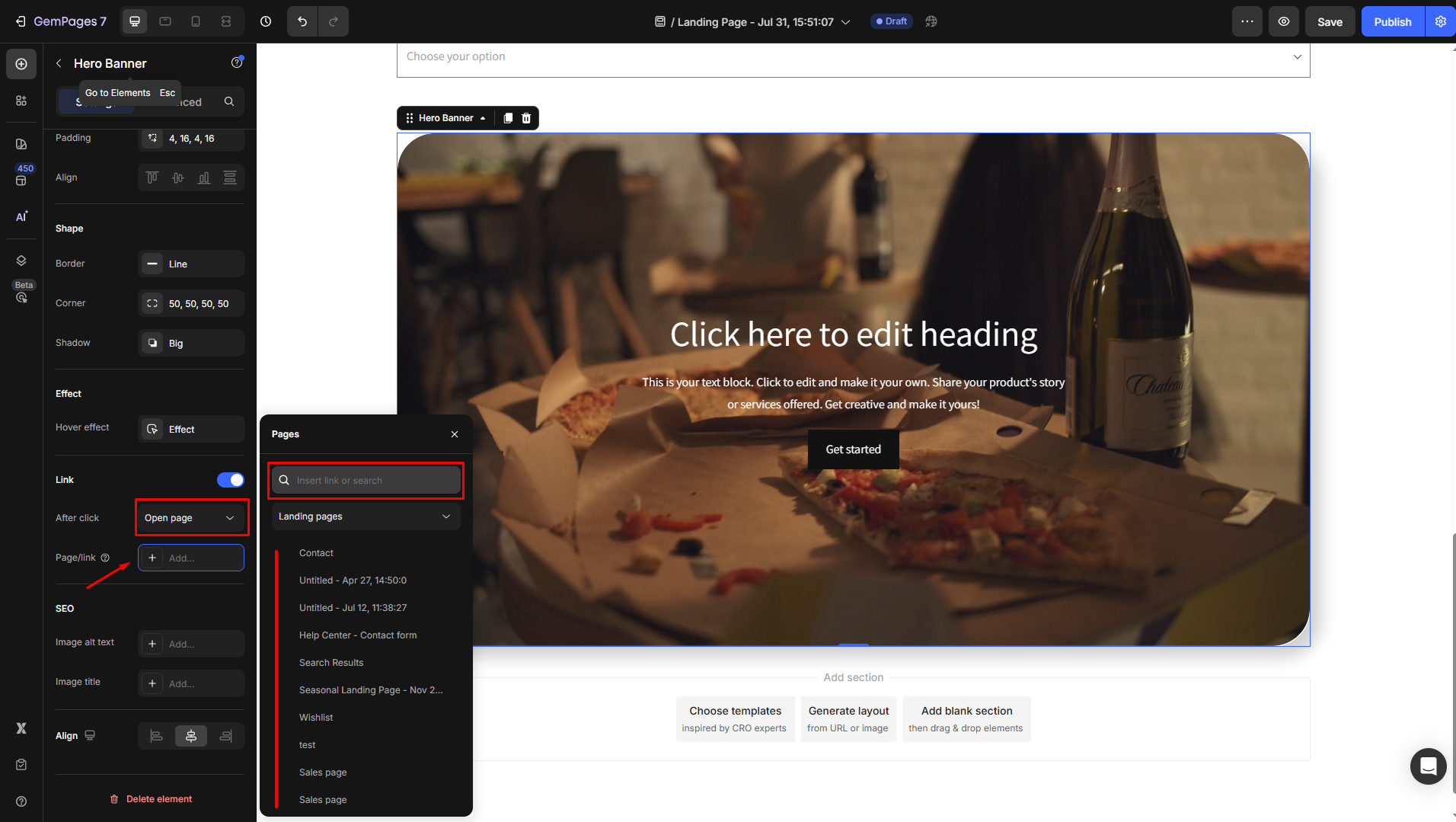 For example, we set the After click = Open page. Then, select the target page by inserting the page link or choosing from the available options: