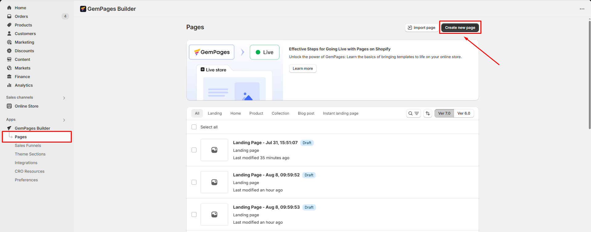 Step 1: From your Shopify admin, go to the GemPages dashboard and locate Pages.