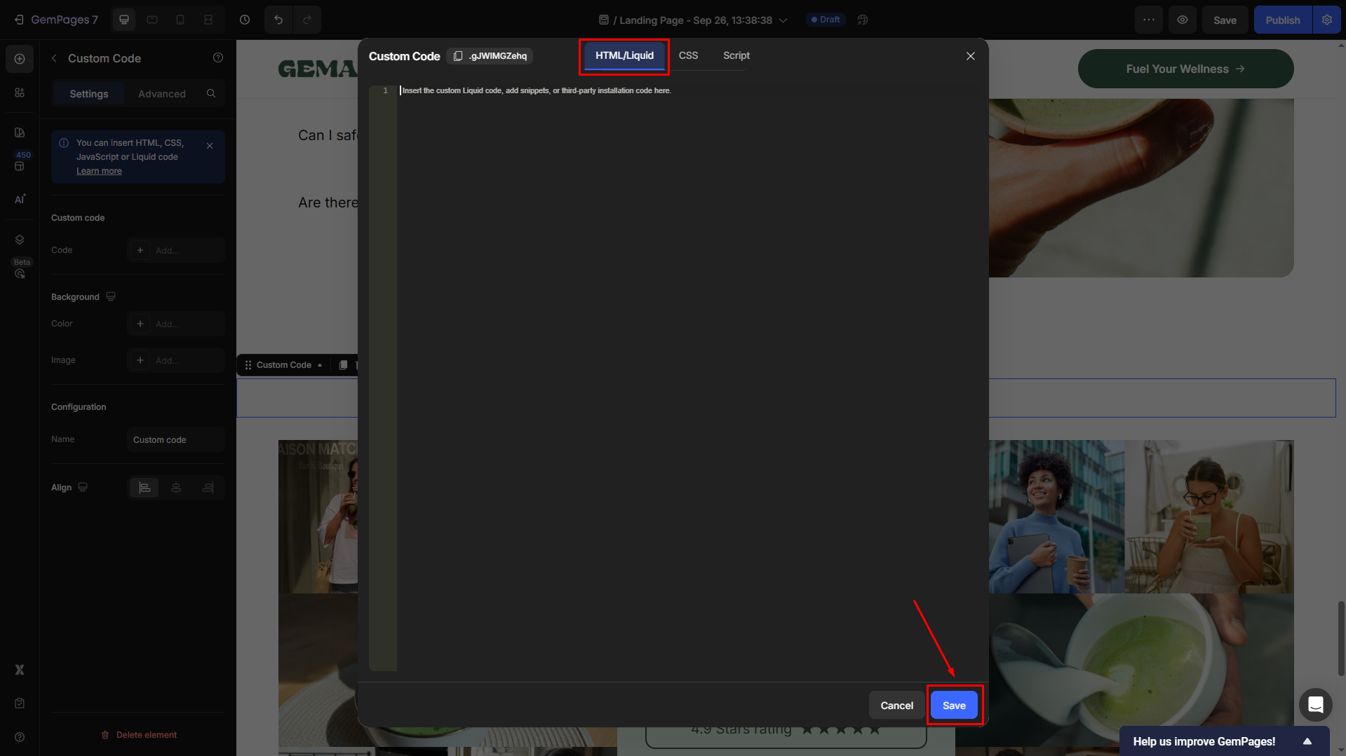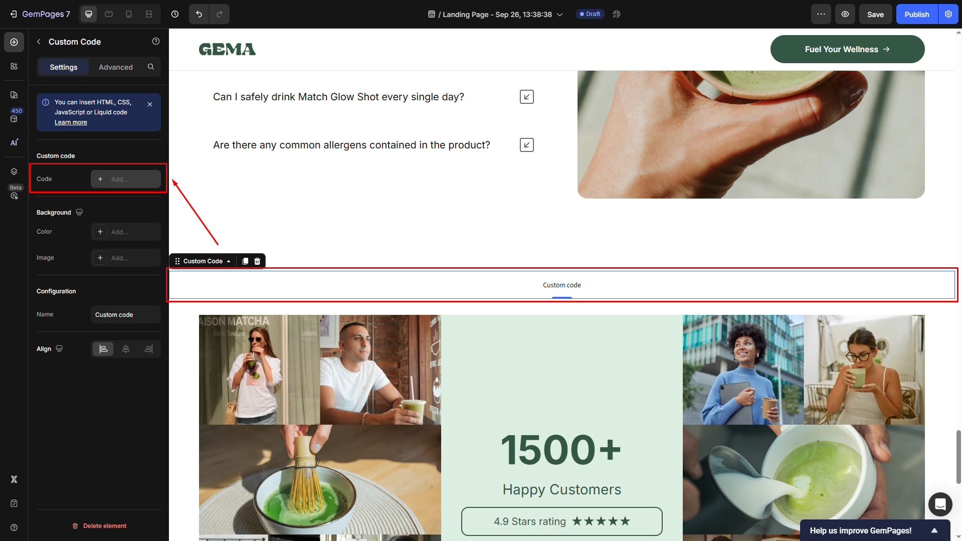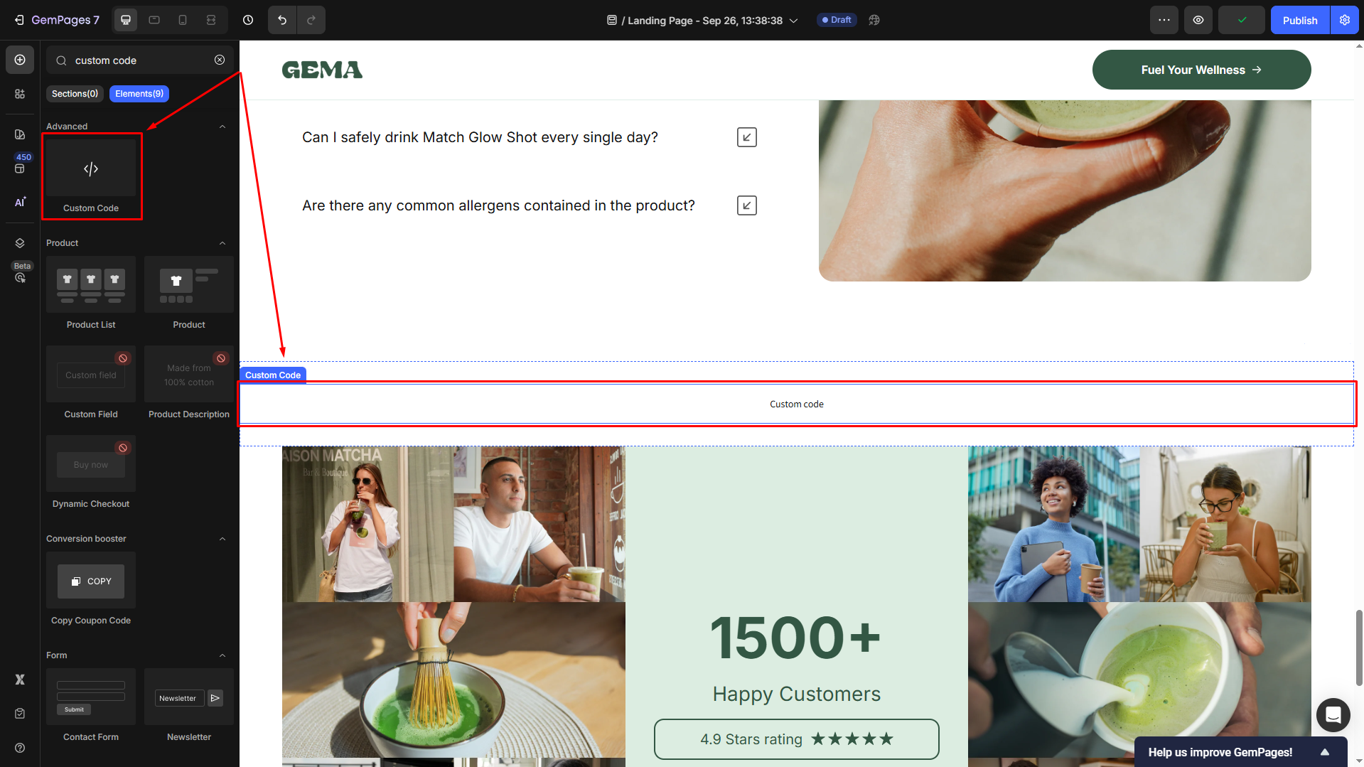 Within GemPages v7, you can use the Custom Code Element to integrate MailChimp into your page. Follow these steps: